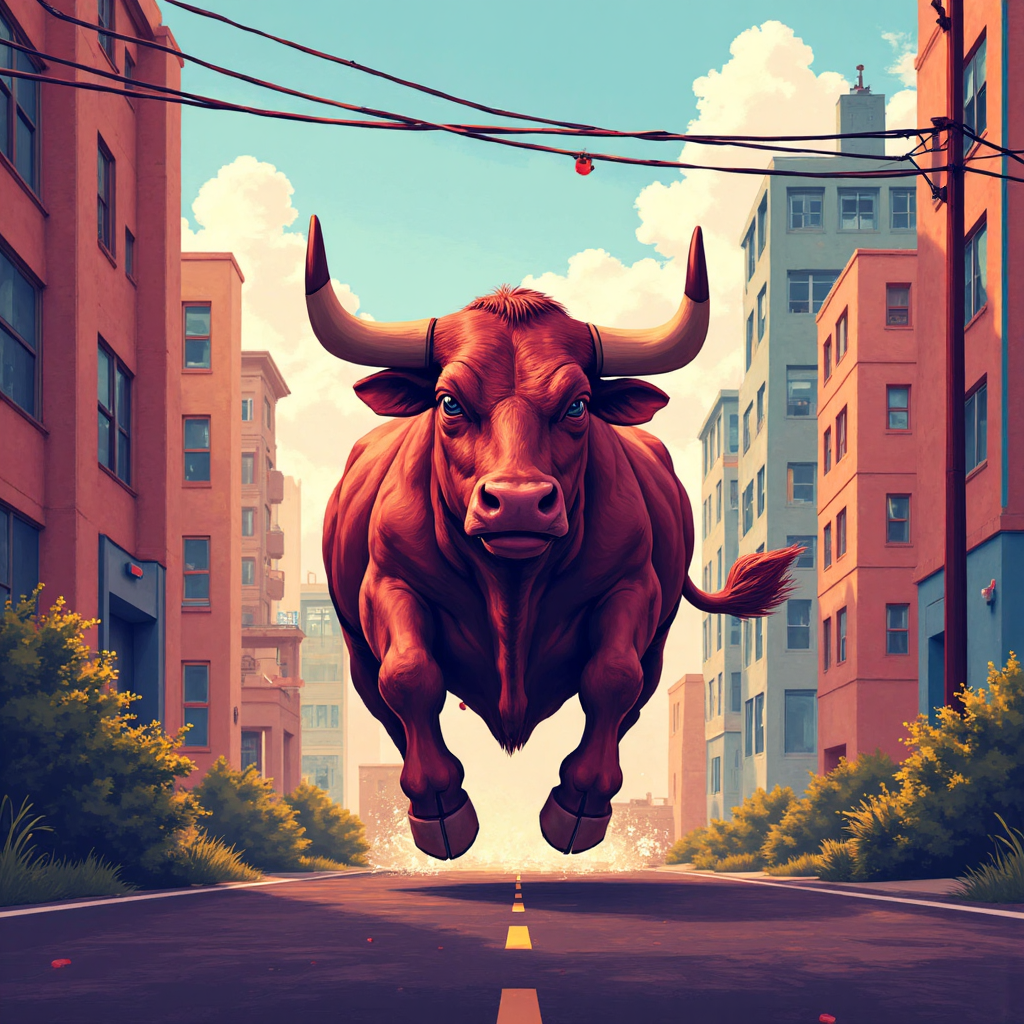 公牛向上衝刺穿越城市景觀的像素藝術插圖,象徵樂觀的市場上漲趨勢