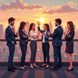 投資者興奮檢視上漲圖表與正面市場指標的像素藝術插圖